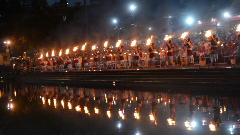 Generalmente los Ghats realizan rituales en el río Ganges, esta ceremonia es dirigida por los sacerdotes o los pandits quienes entonan cantos mientras realizan gestos rituales y movimiento con las lámparas de fuego.